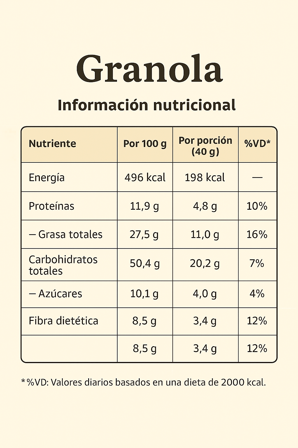 Granola artesanal hecha con avena integral tostada y miel, frutos secos, semillas y coco rallado.